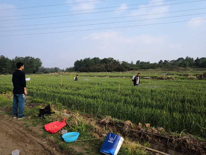 近日,正值小麦抽穗扬花期,也是小麦赤霉病预防关键时期。4月18日和24日,植保教研室陈利军和王国君老师带领所指导的植保15级本科生,先后两次到洋河农艺农机专业合作社教学实习实训场地开展本科生毕业论文“叶菌唑和戊唑醇及其复配制剂对小麦赤霉病田间药效试验”和“信阳主要作物挥发物组分分析及其对病原真菌的诱(驱)作用”。目前,试验已经完成田间小区划分、杀菌剂称量和配制、二次施药、样品采集,将进一步完成病害的调查和小麦挥发物组分的分析等工作。(植物保护教研室)