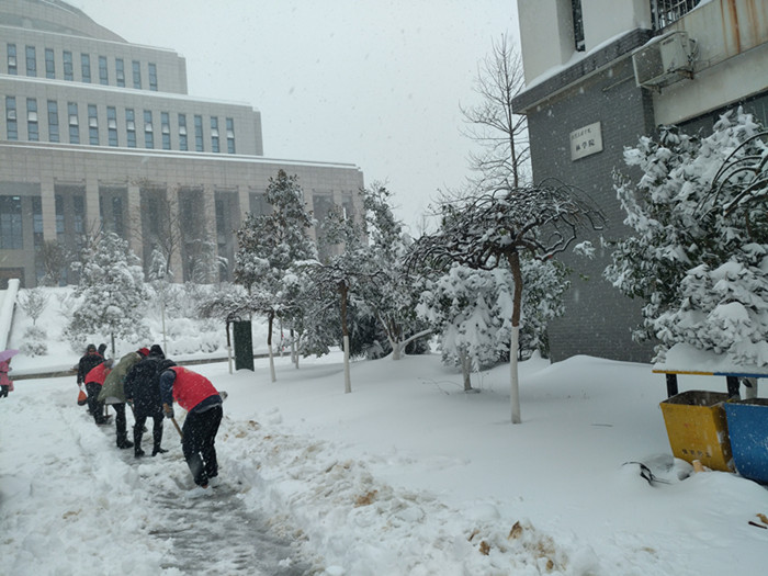 师生们不畏严寒,干得热火朝天。尹院长拿起长竹竿,带领几位青年老师一起清理树枝积雪,保护树木枝干。还有一些老师带领学生们拿起铁锨道路除雪,积极配合,一起奋战,热情感染了每一位路过的师生。经过两个小时左右的劳动,周边的树木得以“直起腰”,一条通向主干道的道路变得“清晰”起来。