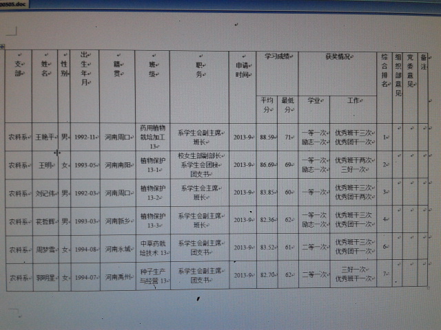 农业科学系党总支关于拟上报王艳平等14位同志为组织发展对象的