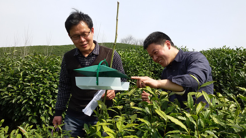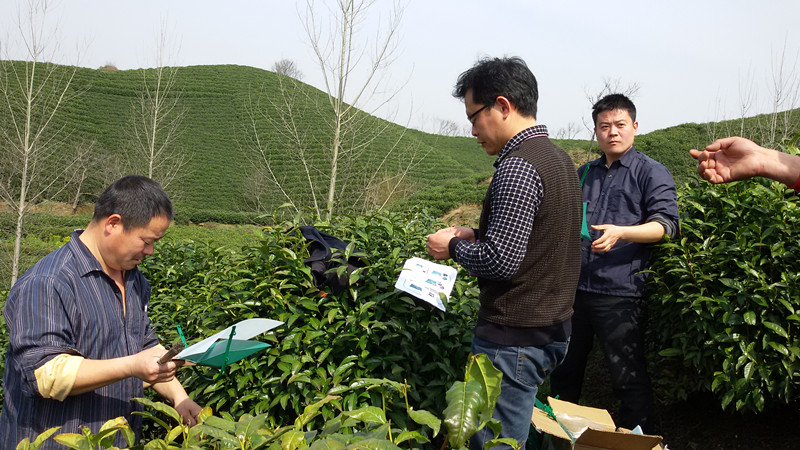 2015年3月22日,豫南植物有害生物绿色防控院士工作站课题组成员史洪中教授、陈利军副教授、潘鹏亮博士等赴浉河港乡开展性信息素诱捕茶尺蠖试验,同时对附近茶园的生态环境进行了观察。