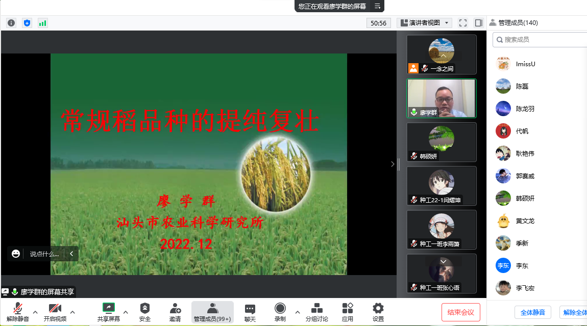 2022年12月6日下午,我院举行“瀹斋论道”第9期学术报告及交流会,会议特邀广东省汕头市农业科学研究所粮油育种推广研究所副主任廖学群高级农艺师做了题为“常规稻品种的提纯复壮”的学术报告。会议由农学教研室主任卫云飞主持,农学院师生共计150余人通过腾讯会议参会。