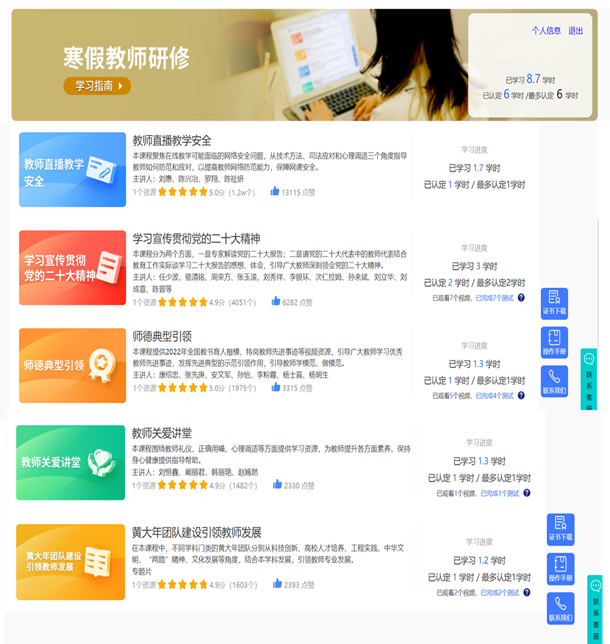 2022年12月15日至2023年2月28日,我院全体专任教师参加了2023年寒假教师研修活动。其中,2022年12月15日至2023年1月5日进行了“教师直播教学安全培训”课程学习;2023年1月5日至2023年2月28日进行了四个专题课程的学习,包括:学习宣传贯彻党的二十大精神、师德典型引领、教师关爱讲堂和黄大年团队建设引领教师发展。每门课程提供有若干学习资源,参加研修教师可以按需选学。