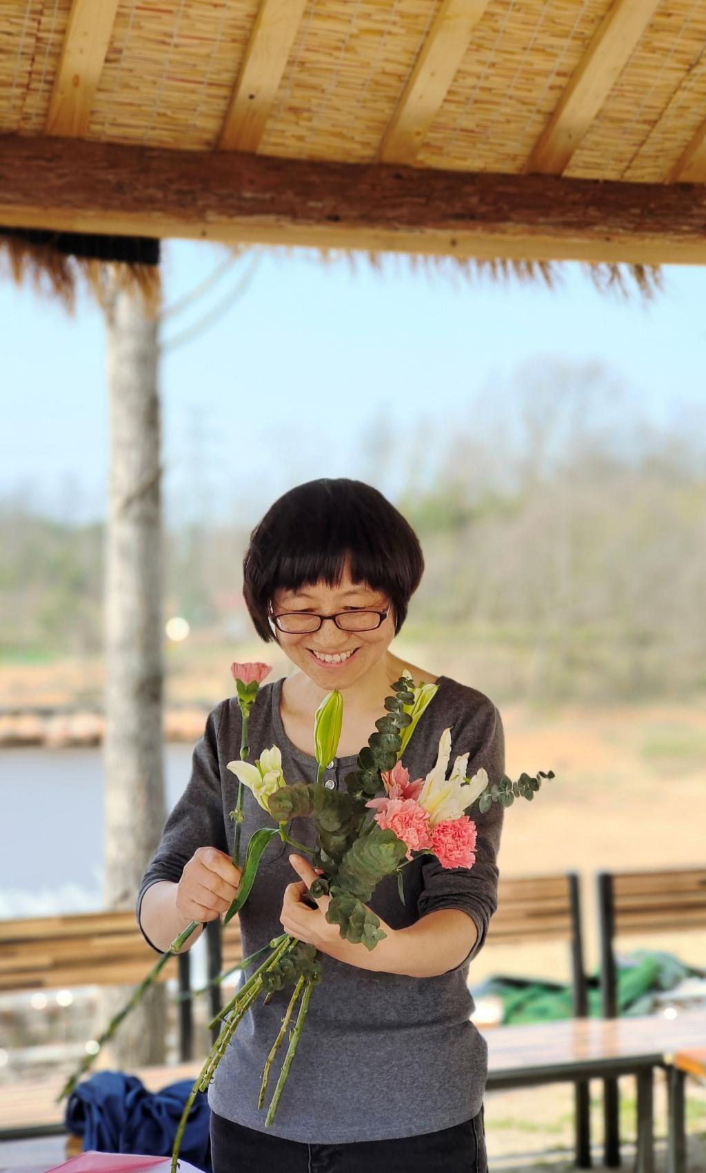 下午,教师们体验了一场沉浸式的插花活动。花艺老师对插花的基本技艺以及用到的花材进行了简单介绍,并指导大家进行实操插花。在花艺老师的耐心指导下,教师们边学、边做、边交流,通过修枝剪叶、整理花朵、讨论扦插位置、花朵搭配等,用一双双巧手将一把散落的花材细致地置入花篮或花纸中,一捧捧错落有致、色彩鲜艳、造型各异的插花作品展现在大家面前,寄托着大家对美的理解和对幸福的感悟。