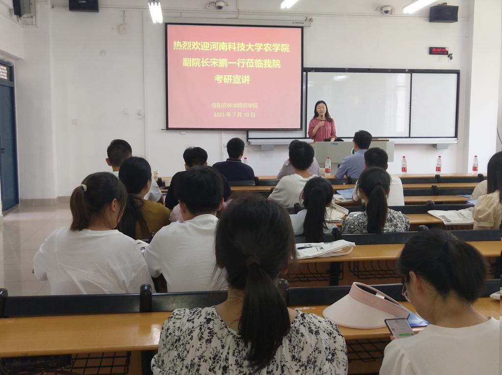 为帮助我院学生了解考研形势,调整备考状态,明确考研目标,2023年7月10日下午在2教116,河南科技大学农学院副院长宋鹏、研究生秘书宋程伟,辅导员张茹佳老师一行3人在2教116为我院2024届学生做考研宣讲会。会议由学院副院长董丽平主持,农学院专业教师张莉、刘娟及部分2024届毕业生参加。