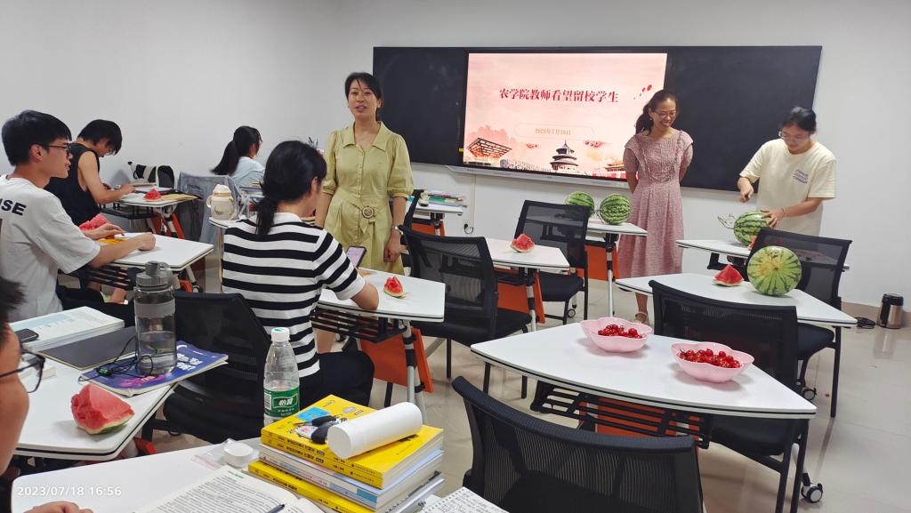 炎炎夏日,骄阳似火。为了了解留校学生的学习和生活情况,7月18日农学院党总支书记李传保,党总支副书记王付娟,以及教师代表来到农学院自习室看望慰问2024届考研留校学生。