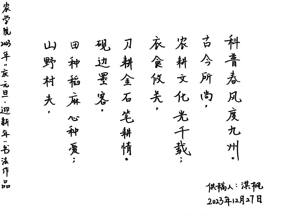为了丰富教职工的业余生活,提升学院老师的精神面貌,2023年12月,农学院举办了2023年“庆元旦 迎新年”书画摄影作品比赛,共收集到32幅绘画、书法、摄影作品。经过学院评比,潘鹏亮老师以小篆书写的《昆虫赋》获得一等奖,洪枫老师的书法作品《农耕文化颂》、耿书宝老师的摄影作品《红绿映初心,实践出真知》、季新老师的摄影作品《脚下有泥土 心中有力量;东方红上竞春耕》获得二等奖。
