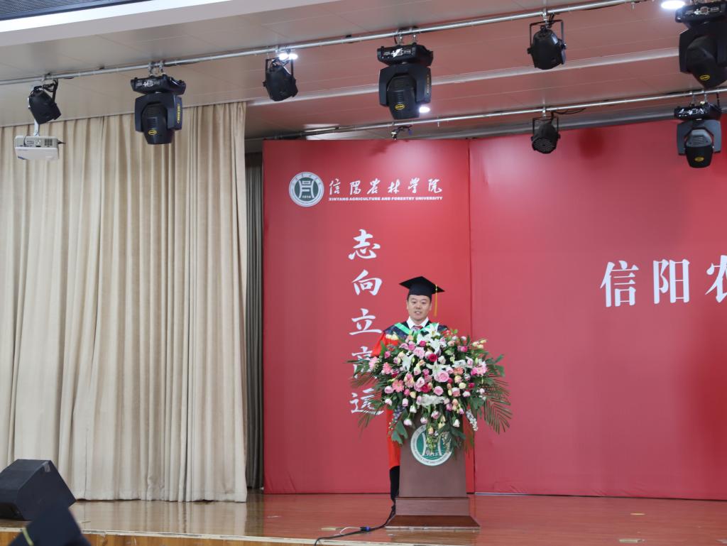 毕业典礼在国歌声中拉开了序幕。学院学位评定分委员会副主席、学院副院长董丽平副教授宣读了2024届本科毕业生学士学位授予决定。学院学位评定分委员会委员,学院副院长耿书宝副教授宣读了2024届毕业生学士学位授予名单,向圆满完成学业,获得学位的同学们表示热烈的祝贺。随后,教师代表刘合满教授、毕业生代表曾文博和在校生代表赵俊凯依次上台发言。学校学位评定委员会委员、农学院学位评定分委员会主席、学院院长陈利军教授为2024届毕业生致辞,他对毕业生提出了三点期望:一是坚定理想信念,矢志不渝;二是立足专业特长,谱写辉煌;三是持续保有本真、芳华永继。随后,在热烈的掌声中,学院学位评定分委员会教师依次为2024届毕业生拨苏正冠、颁发学位证、合影留念。最后,学院党总支书记李传保作总结讲话。他指出,在人生新的征程上各位毕业生要紧跟时代步伐,展现新青年新风貌。一是要赓续奋斗精神,做新时代的不懈奋进者;二是要焕发创新精神,做新时代的坚定开拓者;三是要弘扬奉献精神,做新时代的无私奉献者。