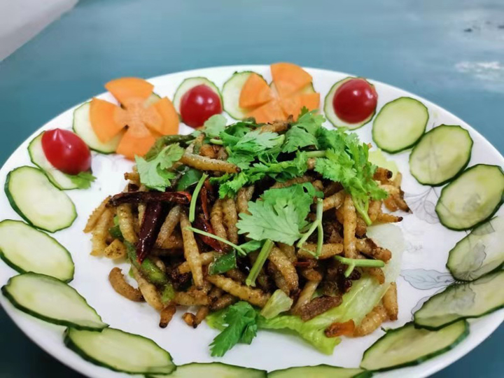 在制作药用昆虫宴的整个过程中,同学们积极参与,小组成员各有分工,清洗昆虫、挑选食材、构思造型、烹饪佳肴等,在精心的劳动和设计中,一个个成品跃然而出。