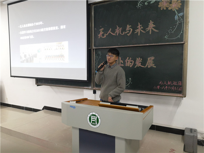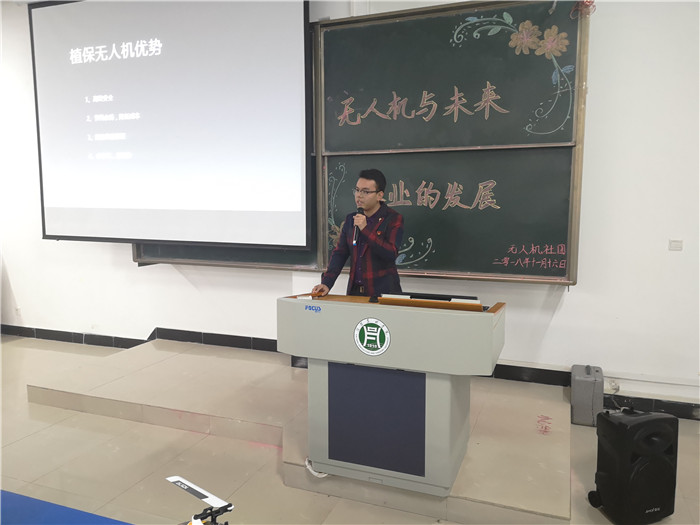 首先,杨金鹏通过PPT向同学们展示了无人机社团的产生与发展。接着,杨晓峰向大家介绍了无人机的机型和发展前景,使同学们对无人机有了一个简单的认识。最后,潘梦豪通过自身经历详细的为同学们介绍了无人机的上的主要构造和它在农业应用是拍摄照片、收集数据、喷洒农药。