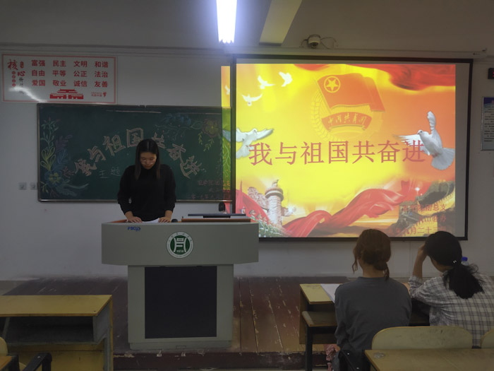 本次活动由18级各班团支书作为主讲人。她们动情讲述了国家民族发展的故事,从1949年,毛泽东带领中国人民获得了民族的解放,到1978年,邓小平为中华民族的振兴绘制了宏伟的蓝图。时光转瞬,斗转星移。08年的汶川地震、08年的北京奥运会、08年9月神舟七号飞船顺利升空。从温饱问题到现在提升全民小康,精准扶贫各项政策的落地推行,祖国在进步,世界在发展,一切美好的憧憬已经展现在眼前。号召同学们把握机遇,奋力向前,坚定决心。鼓励团员们作为新时代的青年,拥有激情,贡献能量,为祖国母亲的繁荣昌盛而努力拼搏,共同奋斗。