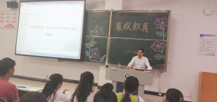 首先,胡书记强调了廉政教育的重要性。接着胡书记从廉洁法规、国家反腐倡廉的形势、践行廉洁行动、倡树廉洁风气四个方面进行了详细的讲述。胡书记举例重点强调了考风考纪问题,希望同学们能够端正考风、做到不敷衍不作弊。最后胡书记对同学们说,希望同学们可以做一个有担当有责任感、严于律己、遵法守法、廉洁公正的大学生,带着这些美好的品质去创造更好的未来。