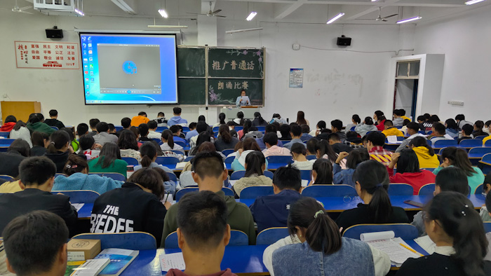 按照学校普通话推广工作的安排,2019年10月17日晚上,我院在一教E102举办“改革开放70周年,学习党的十九大精神”为主题的普通话推广活动。本次活动由宣传部程怡新、娄兆仑同学担任主持人,宣传部干事、新媒体工作部干事组织,宣传部部长贾贤惠、副部长蔡世敏出席,19级同学参加。
