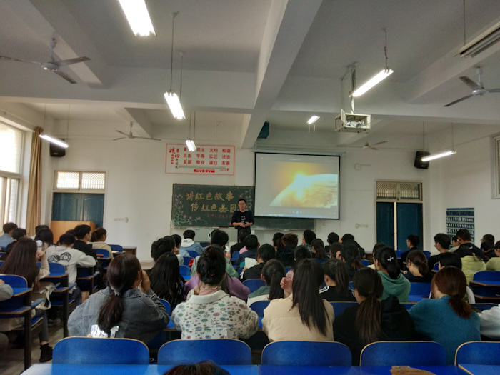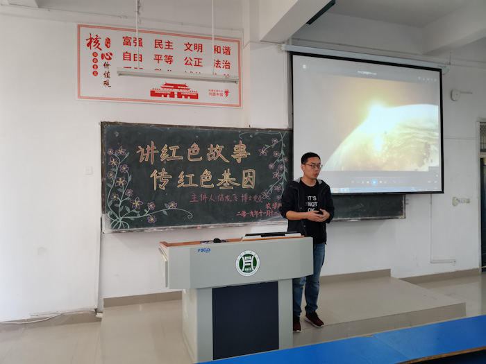 2019年11月12日中午,农学院在一教A105举办了以“讲红色故事,传红色基因”为主题的讲座。本次讲座由党员信龙飞博士担任主讲人,19级学生参加。