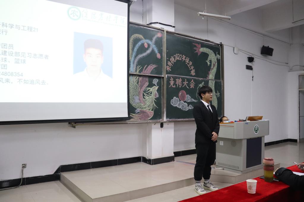 活动伊始,陈磊老师发表开场致辞。他对上一届学生干部的辛勤付出给予高度肯定和感谢。同时,对即将上台竞选的2021级学生干部提出三点殷勤期望:一是正确定位,明确服务宗旨;二是坚持学习,正确引领学生思想;三是团队协作,创新工作方式方法。团总支副书记赵向阳代表老一届学生干部对上一学年学生会工作进行总结,并为新一届成员竞选加油打气。随后,本次换届大会以竞聘演讲的形式拉开帷幕,各部门候选人逐一上台进行竞聘演讲,充分展示自己的能力作风,畅谈在学生自我服务机构的工作感想。