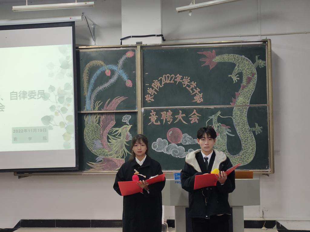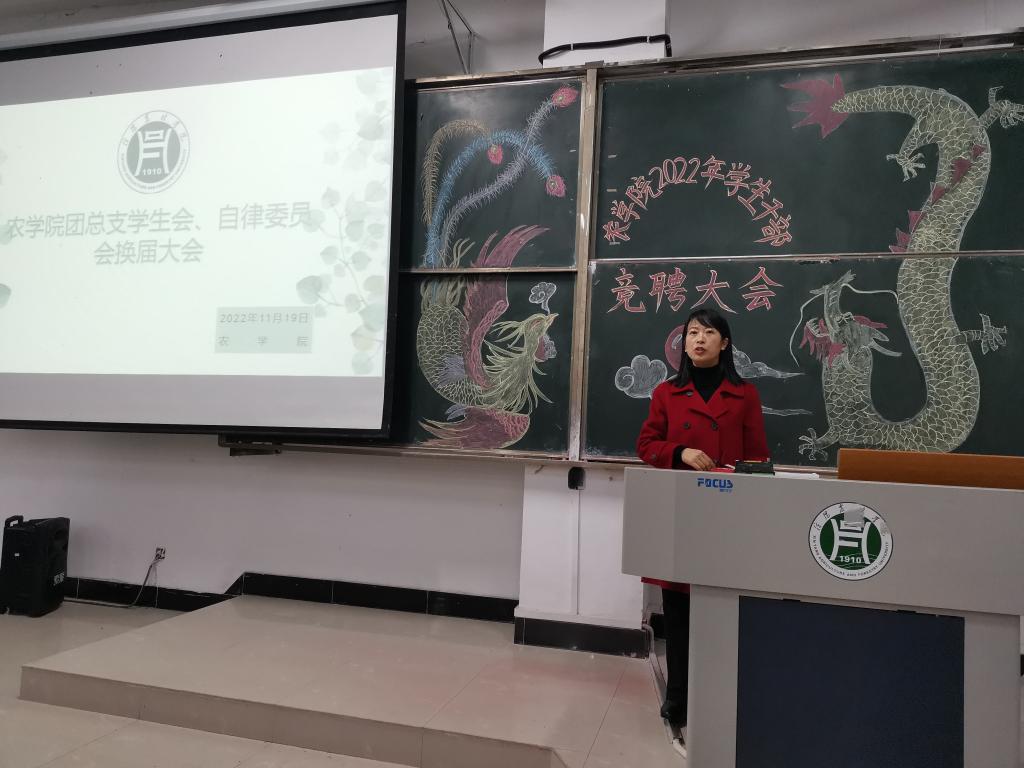 11月19日上午,农学院在一教E102举行团总支、学生会、自律委学生干部换届大会。院党总支副书记王付娟、团总支书记陈磊及学工组老师杨春玲、尤伟晨应邀出席,2020级部分学生干部代表、2022级班长团支书、2021级各部门竞选成员参加。本次活动严格遵守学校疫情防控要求,全员佩戴口罩。