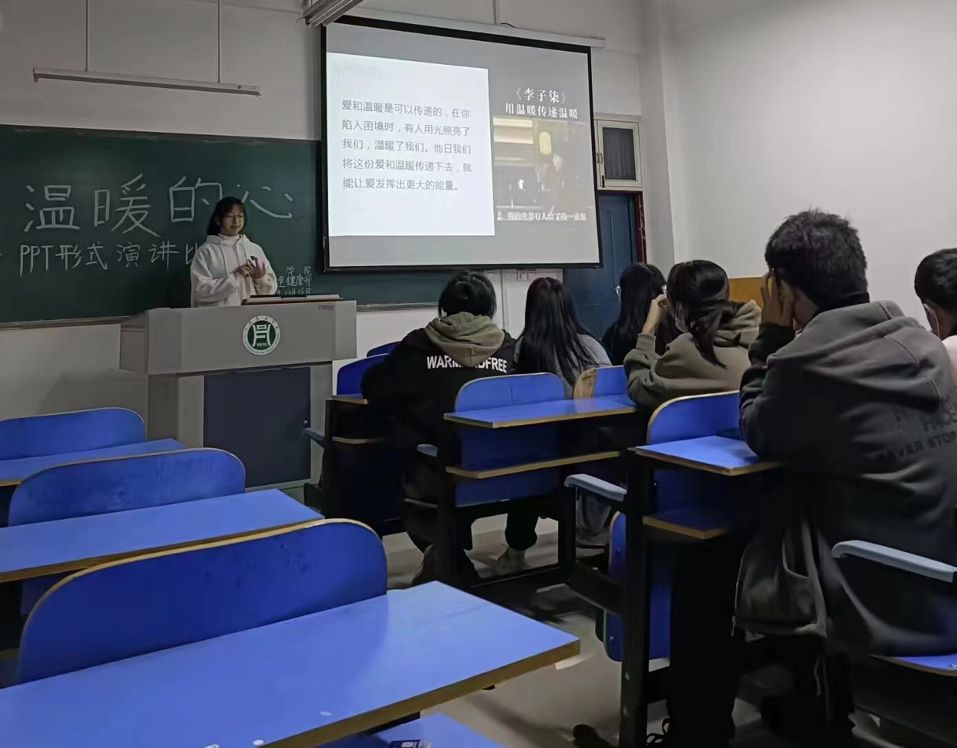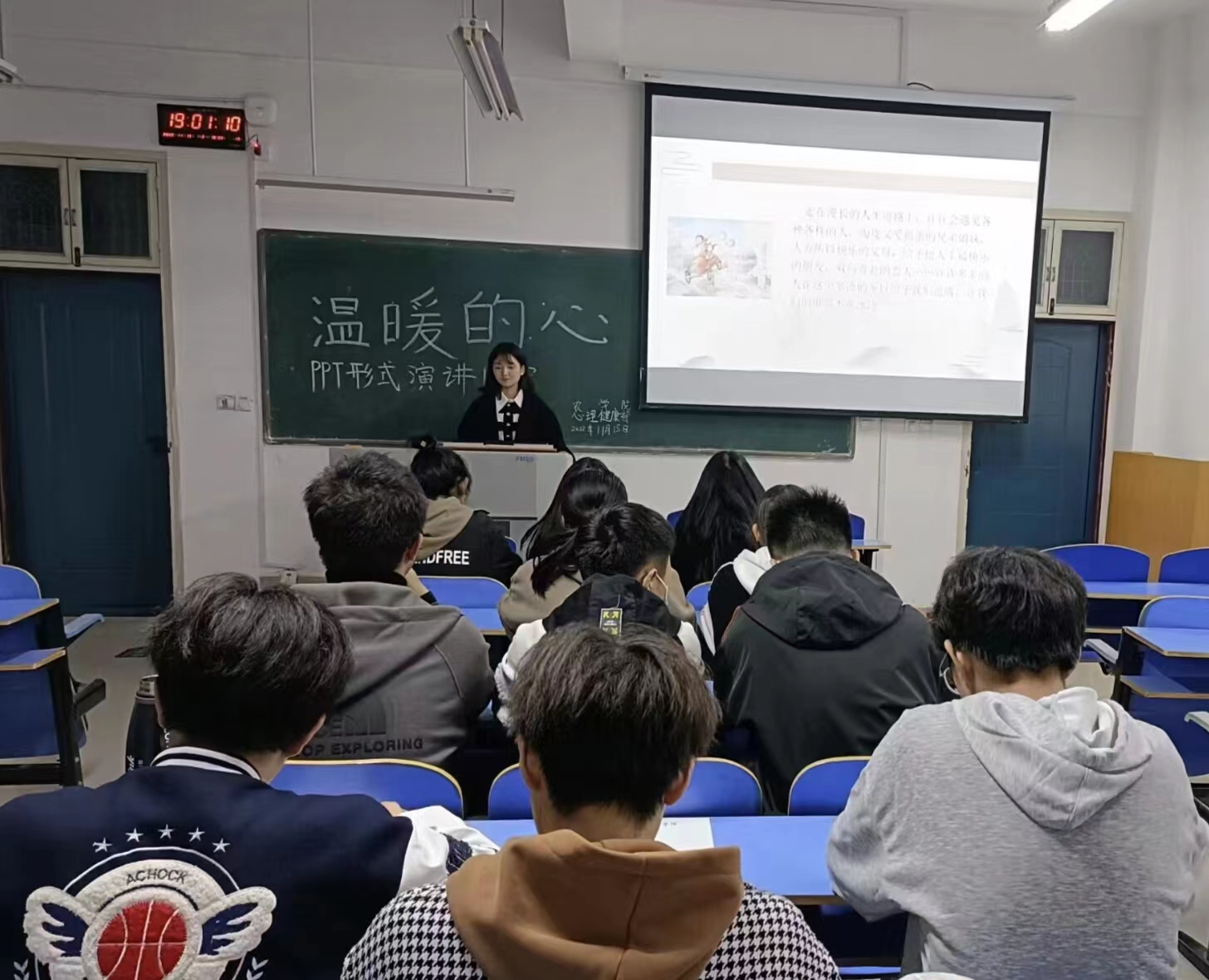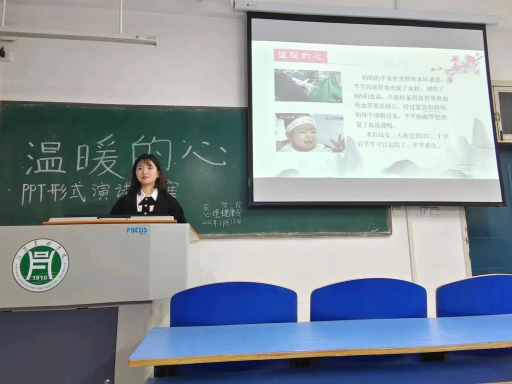 为加强学生的心理健康教育,传播心理健康知识,缓解同学们焦虑的情绪。农学院于2022年11月15日晚18:50在一教A201举办了以“温暖的心”为主题的PPT演讲比赛。本次活动由我院学工组杨春玲老师带领21级,22级同学参加。