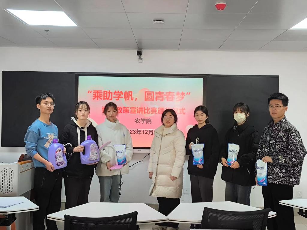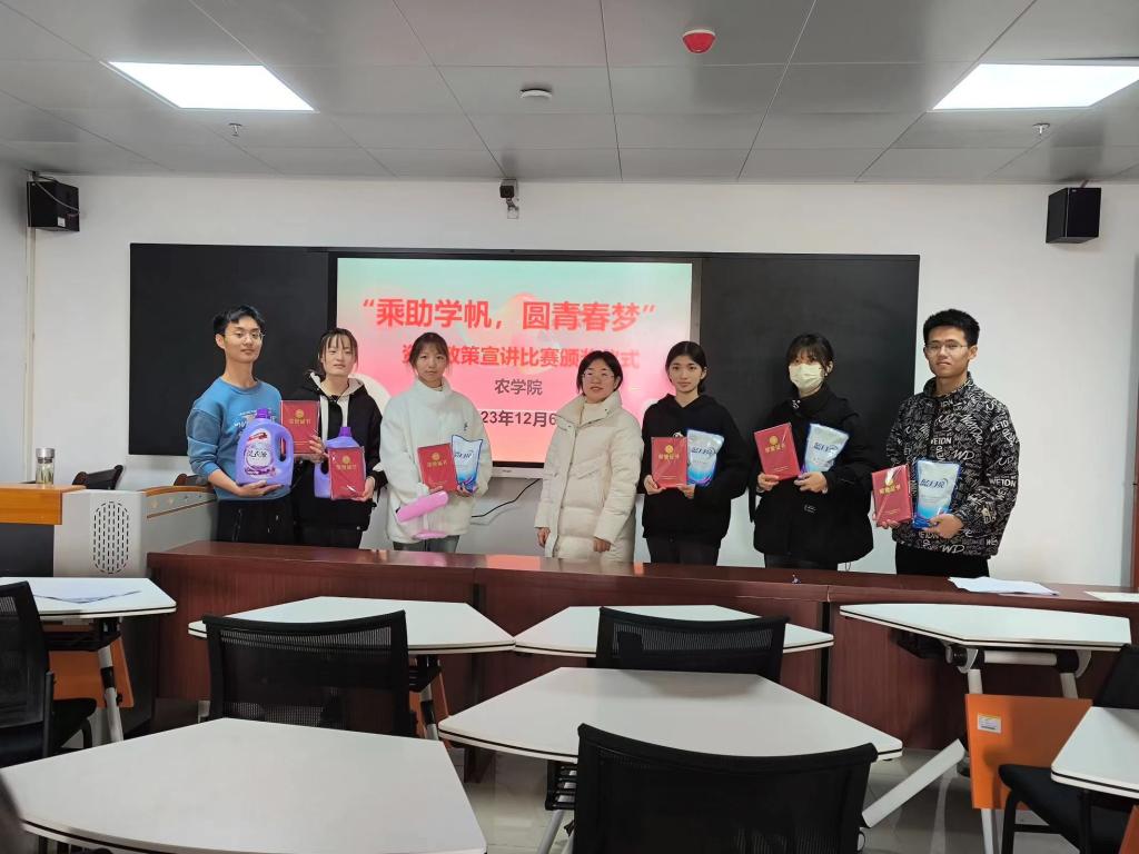 为进一步落实立德树人根本任务,加大资助政策宣传力度。2023年11月28日晚农学院在二教308举办了以“乘助学帆,圆青春梦”为主题的资助政策宣讲比赛。本次活动由我院22和23级同学参加,经过前期班级初赛,遴选出9名同学参加决赛。
