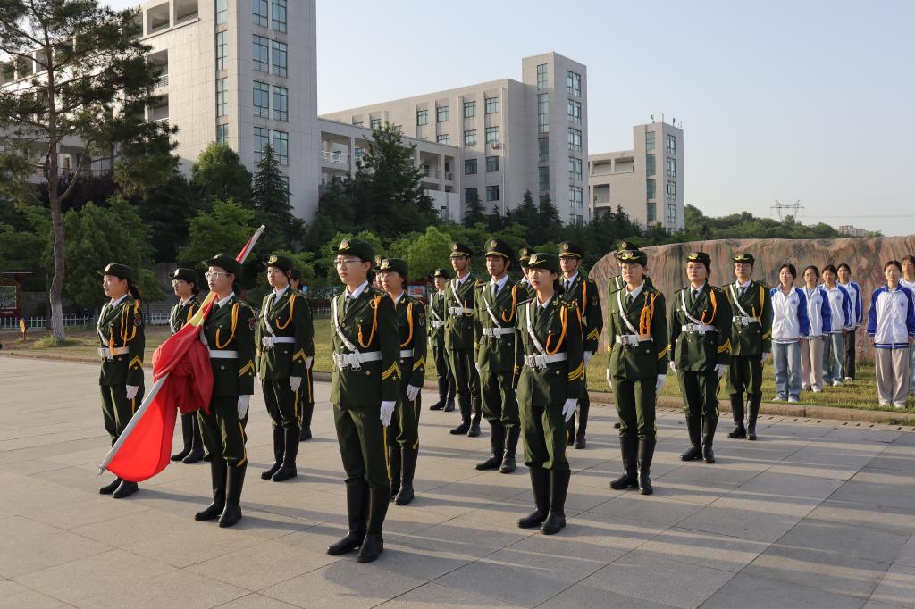 迎着春日的朝阳,国旗护卫队迈着坚定整齐的步伐,护送国旗走向升旗台。伴随着庄严的《义勇军进行曲》,护旗手振臂一挥,鲜艳的五星红旗冉冉升起,在初升阳光的映照中、全体学生的注目下,五星红旗迎风飘扬在汝宁广场的上空,与校园的美景交相辉映。在场的每一个人向国旗行注目礼,深怀对祖国无限的热爱和崇高的敬意。