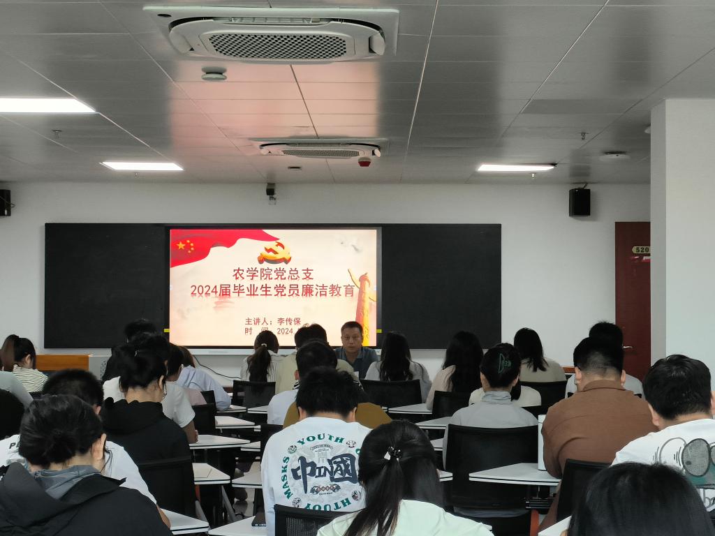 2024年5月28日下午,农学院党总支在学术交流中心520举办了2024届毕业生党员廉洁教育专题讲座,院党总支书记李传保主讲,50余名毕业生党员参加。