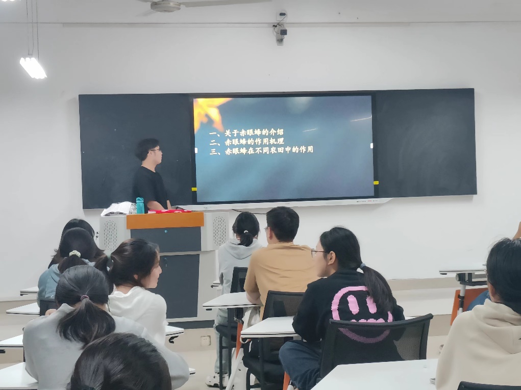 活动开始后,无人机社团社长陈超介绍了植保专业与无人机之间的关联以及“以虫治虫”中的赤眼蜂。副社长窦行通介绍了如何用植保无人机进行以虫治虫的案例。最后,陈超给大家讲解了无人机、无人机模拟器操作的注意事项。