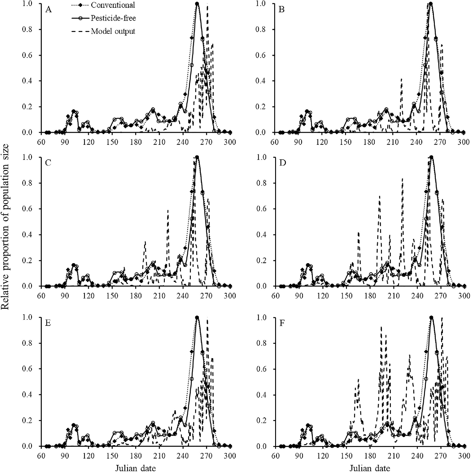 金纹细蛾是苹果树的重要害虫之一,年发生4–6代,幼虫潜叶为害严重影响叶片光合作用,导致早期落叶和果实质量下降。温度是影响其发育、存活和繁殖的关键环境因子。本研究基于实验室恒温发育数据与韩国安东地区2015-2016年田间诱捕数据,运用多项数学公式系统构建了春季羽化模型、成虫产卵模型和阶段发育模型,最终组合成种群动态模型。研究结果显示,该模型能准确预测金纹细蛾发生世代数,并成功预测各代成虫发生高峰期,与实际观测数据偏差在7天以内。通过六种不同情景模拟,发现综合考虑农药使用与天敌寄生的死亡率,可更真实地反映田间种群数量变化。