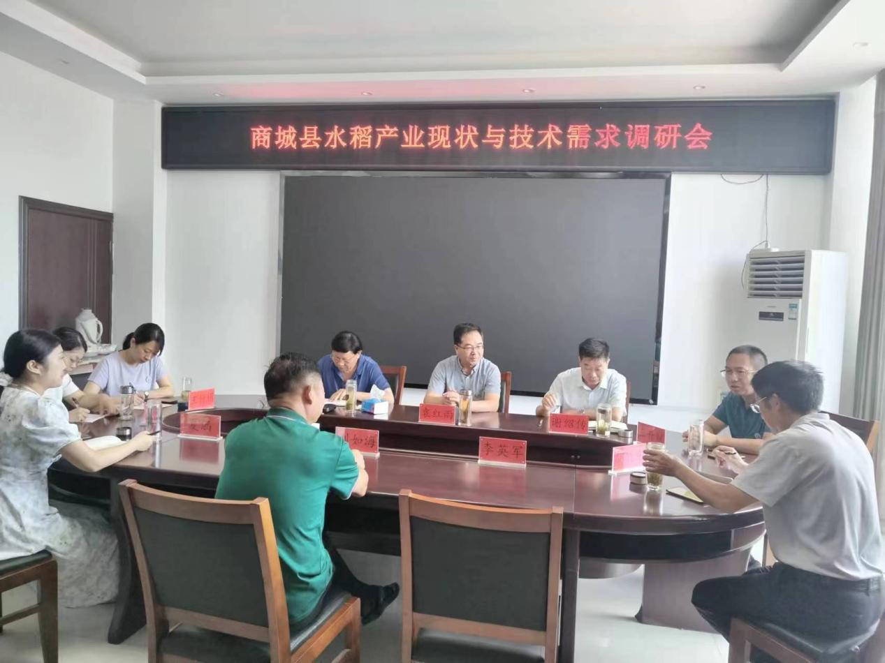为全面了解商城县水稻发展现状和产业技术需求,2024年7月25日,我院教师王付娟、宋晓华作为信阳市优质水稻产业科技特派员服务团成员与服务团团长信阳师范大学袁红雨教授、信阳师范大学兼职教授宋世枝研究员、信阳市农业农村局农技站副站长王开斌高级农艺师一行五人赴商城县开展水稻产业现状与技术需求调研。商城县科技局局长谢绍传、商城县农业农村局研究员胡敬东、商城县碧水蓝天合作社董事长李英军、商城县长青合作社董事长刘如海、商城县科技局办公室主任夏涵参加座谈会。谢绍传主持座谈会。