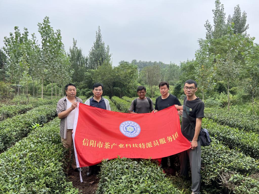 为促进信阳市茶产业的高质量发展,并充分发挥科技在茶产业中的支撑作用,2024年9月26日,信阳市茶产业科技特派员服务团(以下简称“服务团”)团长王国君副教授、河南省科技特派员史洪中教授、郭世保副教授、王春生博士分别前往信阳市浉河港茶园,开展了一项关键的科技试验——应用植物免疫激活蛋白于茶树上。