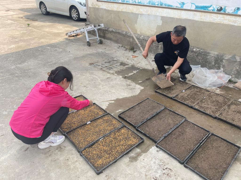 在了解小麦收获情况的同时,服务团还与公司就下一步的种植计划进行了深入探讨。为了优化轮作体系,提高土地利用率和产出效益,公司准备种植水稻,鲁伟林研究员为公司提供了优质水稻示范材料,详细介绍了水稻的种植技术和管理要点,并带领服务团成员进行现场播种育秧,并将持续测定各品种在田间的生长数据,为下年公司的水稻品种选择提供参考。