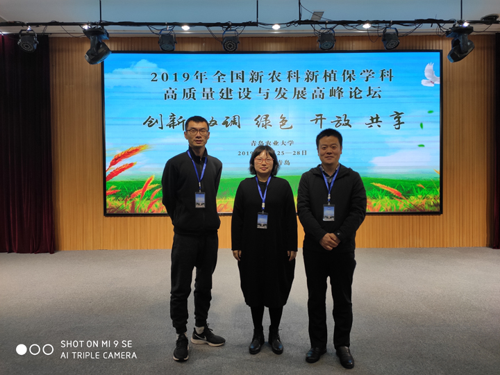 为全面贯彻习近平新时代中国特色社会主义思想,深入落实全国教育大会精神和“创新、协调、绿色、开放、共享”新发展理念,积极助力乡村振兴国家战略,聚集研讨和大力推进“新农科”背景下植物保护学科的高质量建设与发展,2019年10月25日至28日,“2019年全国新农科新植保学科高质量建设与发展高峰论坛”在山东青岛农业大学举行,我院植物保护教研室陈利军、刘红敏、王国君一行三人参加了会议。