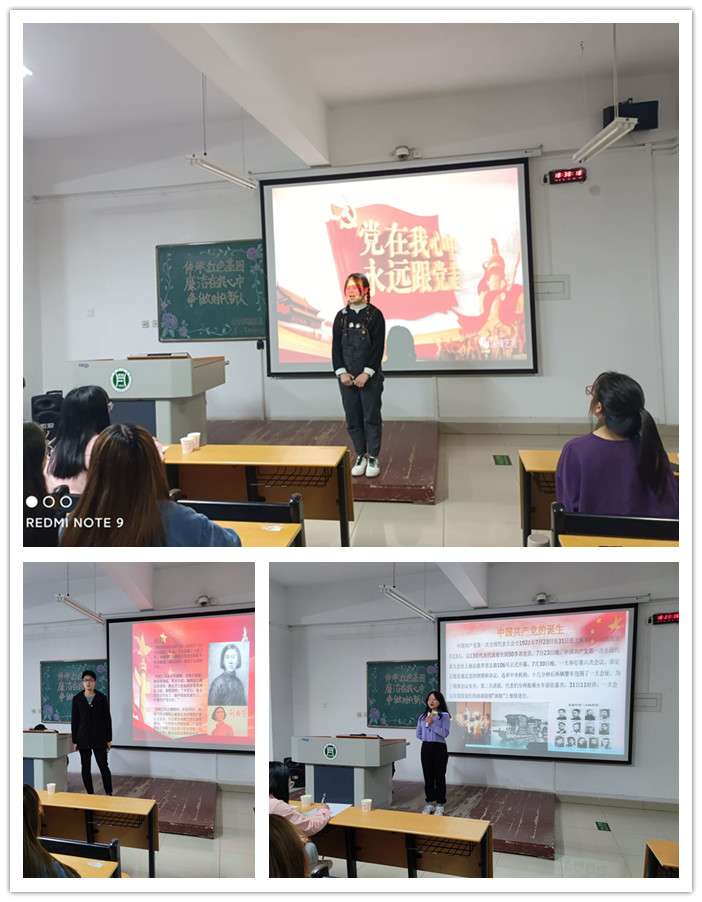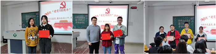 主持人介绍了比赛的精神、评分标准和评委老师,并宣布了演讲比赛正式开始,参赛人员依次上台发表自己的演讲。演讲者声情并茂、慷慨激昂地讲述了中国共产党成立以来的光辉历程,让在场的同学们感悟到一个国家、一个民族有了英雄的人民,才能屹立不倒。随后,评委老师对参赛人员做出了点评。学生处张老师对同学们的演讲技巧以及内容进行了指导,鼓励同学们勇敢展现自我。洪老师结合信阳大别山红色资源,向同学们讲述了红色基因的历史意义,并激励同学们学好党史,讲好党的故事。刘老师对参与热情给予了充分肯定,期待同学们不断成长为新时代有为的青年。接着,主持人宣布得分情况和比赛名次,评委老师和获奖人员合影留念。