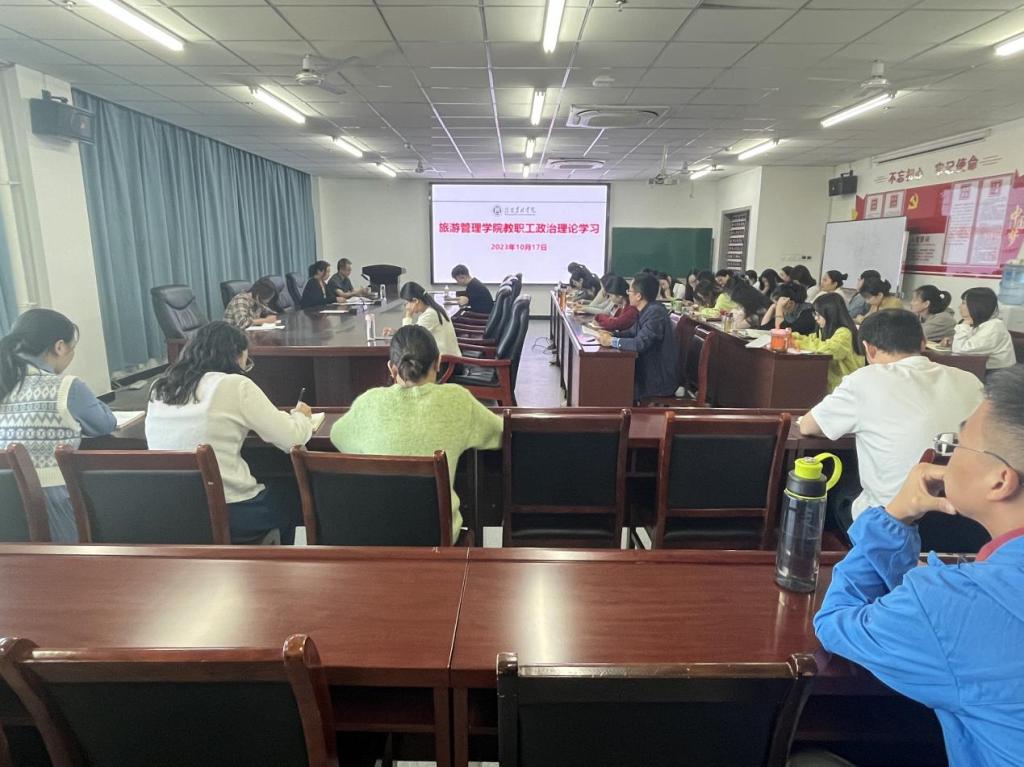 10月17日下午,旅游管理院党总支在双创中心310会议室开展教职工政治理论学习会。会议由党总支副书记杜丽主持,全体教职工参会。