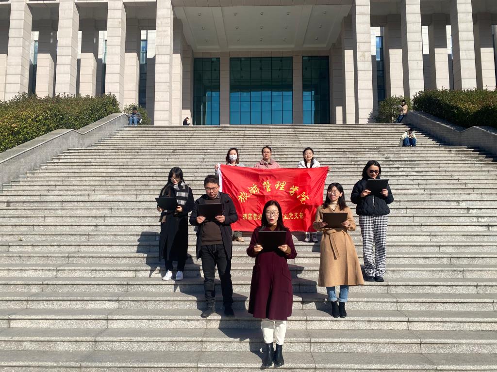 为进一步贯彻落实党的十九届中全会精神,唱响主旋律,弘扬正能量,11月24日,旅游管理学院酒店管理专业教研室党支部在图书馆前开展十九届六中全会精神学习宣讲活动,此次活动由党支部书记于洋同志主持,全体支部党员和入党积极分子参加此次活动