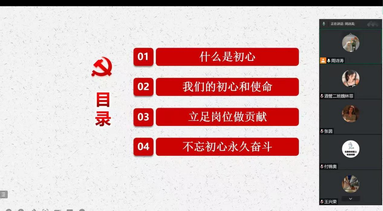 为加强2022届毕业生党员教育,引导毕业生党员坚定理想信念,树立廉洁自律意识,走好职场人生第一步,2022年5月25日,酒店管理专业学生党支部开展了以“不忘初心强党性 永葆本色守廉洁”为主题的毕业生党员廉洁教育会议。党支部书记周诗涛担任主讲,支部委员及毕业生全体党员参加了会议。
