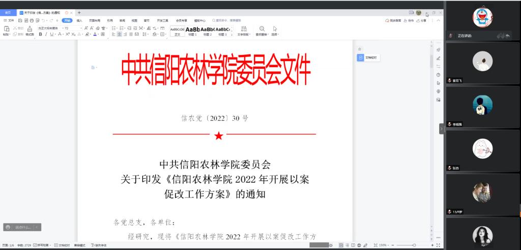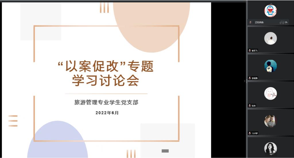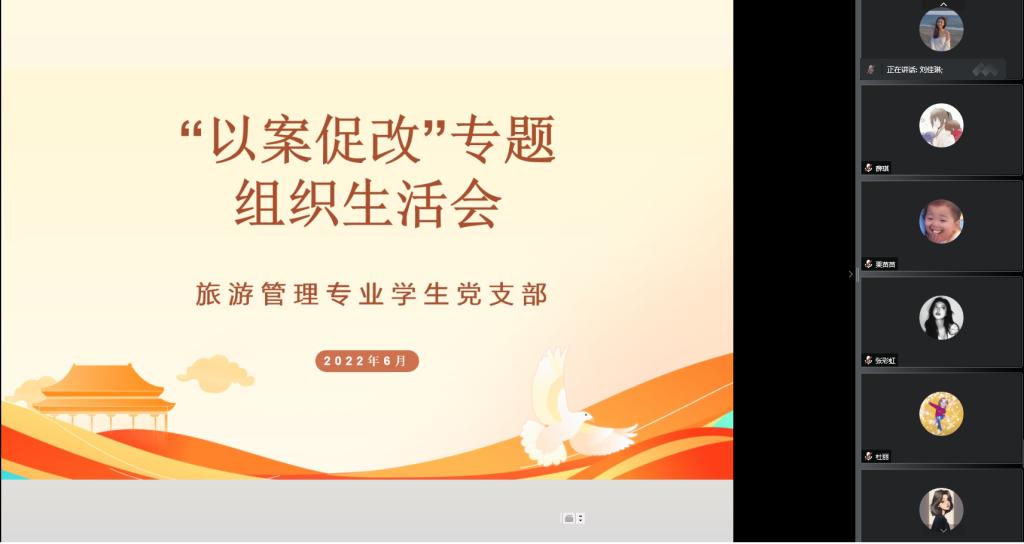 6月13日下午,旅游管理专业学生党支部在线上召开了“以案促改”专题组织生活会,会议由支部书记徐晓琰主持,院党总支副书记杜丽以普通党员的身份参加了会议。
