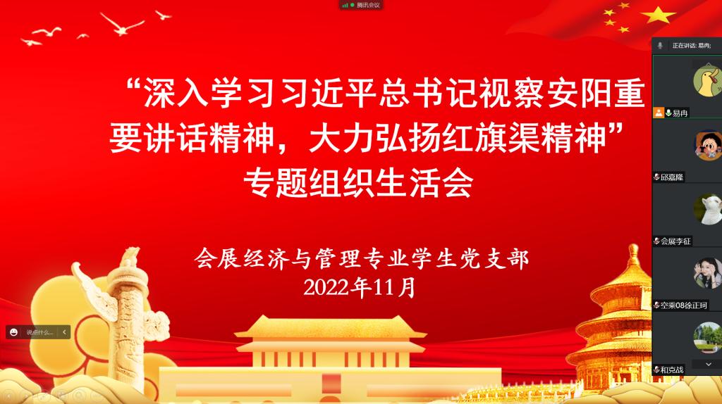 11月23日下午,会展经济与管理专业学生党支部开展了“深入学习习近平总书记视察安阳重要讲话精神,大力弘扬红旗渠精神”专题组织生活会,会议由支部书记易冉主持,支部全体党员参加。