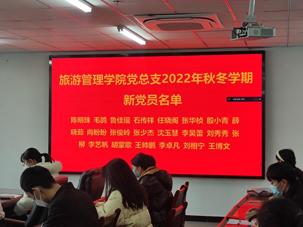 12月14日下午,旅游管理学院党总支在双创310隆重举行2022年秋冬学期新党员入党宣誓暨党员重温入党誓词主题党日活动,旅游管理专业学生党支部全体党员和部分入党积极分子代表参与了本次活动。活动由余兵主持。