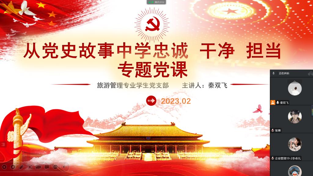 2月19日,旅游管理专业学生党支部开展了以“从党史故事中学忠诚、干净、担当”为主题的专题党课。党支部书记秦双飞担任主讲,支部全体党员参加了会议。