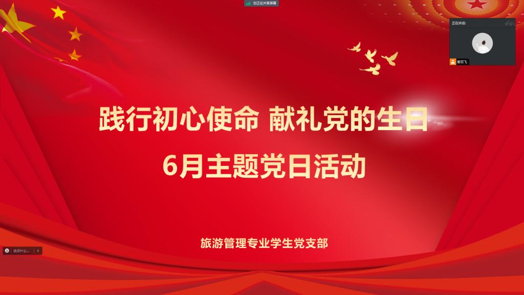 6月19日,旅游管理专业学生党支部线上组织开展了以“践行初心使命 献礼党的生日”为主题的6月主题党日活动,此次活动由支部书记秦双飞主持,支部全体党员参加。