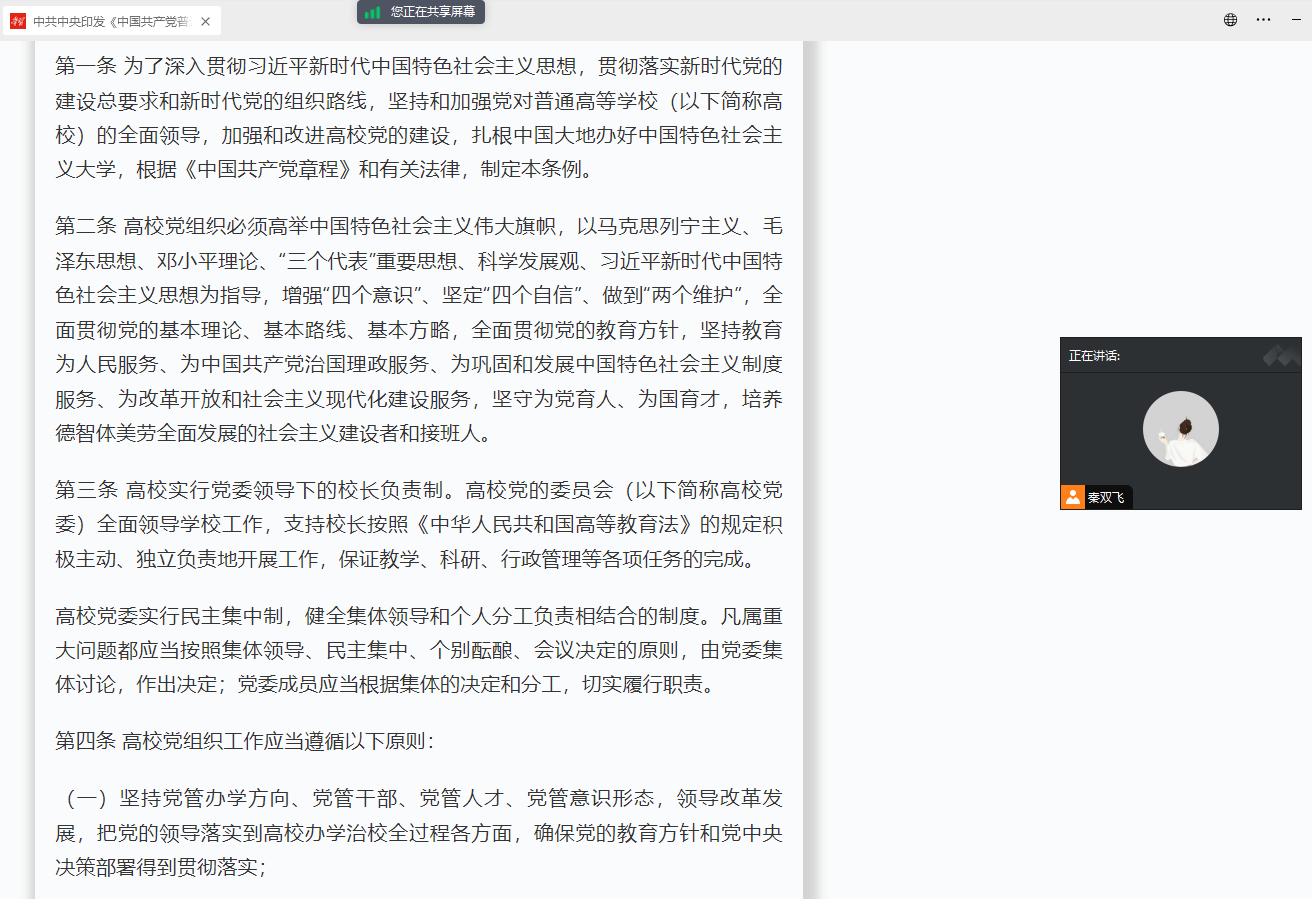 会议集中学习了习近平总书记在文化传承发展座谈会上的讲话《担负起新的文化使命努力建设中华民族现代文明》以及《求是》杂志发表的习近平总书记重要文章《健全全面从严治党体系推动新时代党的建设新的伟大工程向纵深发展》。在党的生日来临之际,全体党员重温了《中国共产党普通高等学校基层组织工作条例》,进一步强化党员思想认识,织牢织密组织建设这张网,规范组织纪律。