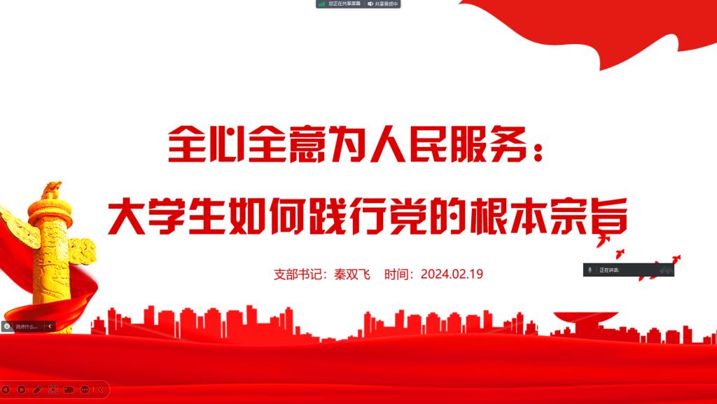 2024年2月19日,旅游管理专业学生党支部开展了以“全心全意为人民服务:大学生如何践行党的根本宗旨”为主题的专题党课。党支部书记秦双飞担任主讲,支部全体党员参加了会议。