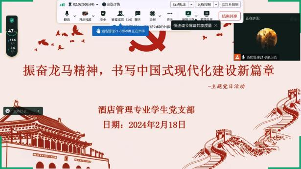 2024年2月18日,酒店管理专业学生党支部线上开展了主题为“振奋龙马精神,书写中国式现代化建设新篇章”的党日活动。会议由酒店管理专业学生党支部书记张春焕主持,支部全体师生党员参加此次活动。
