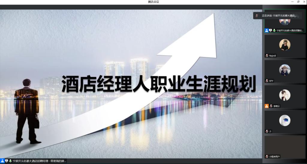 为帮助2022级新生加强对旅游行业的了解,做好大学四年的专业学习规划,2022年9月15日下午,旅游管理学院在线上开展了以“酒店经理人职业生涯规划”为主题的新生入学教育专题讲座。此次讲座邀请旅游管理学院优秀毕业生、宁波开元名都大酒店招聘主管常星海主讲,由酒店管理专业教研室副主任李晓云主持,旅游管理学院部分专业教师、新生辅导员及2022级全体学生参与聆听。