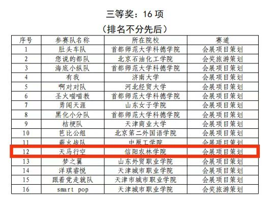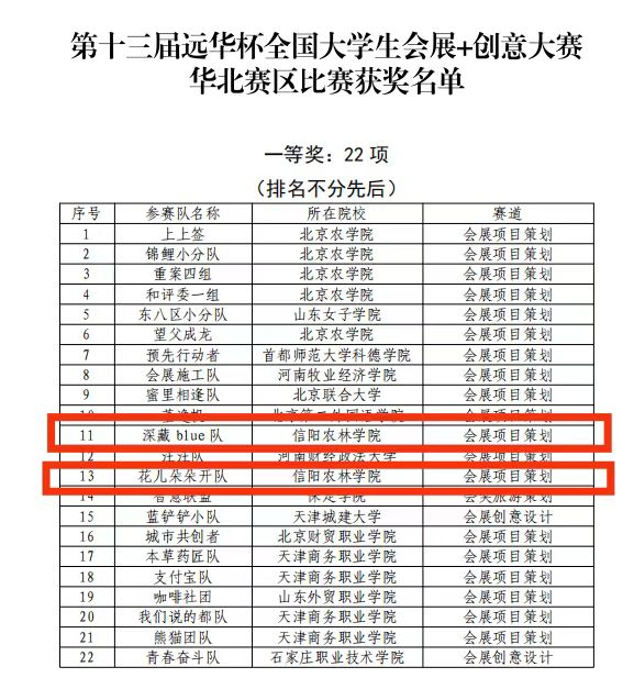 本次大赛共分为三个比赛类别,分别为会展项目策划类、会展创意设计类和会奖旅游策划类,参赛内容涉及会议、展览、旅游、活动等多种形式。比赛流程分为院校初筛和专家评审,华北赛区各院校对作品进行初选,共提交了66项作品参加决赛,经过专家评审团的专业评选,最终我院会展专业共有四支队伍喜获佳绩,胡启蕊老师指导的深藏blue队和丁甜老师指导的花儿朵朵队获得一等奖;曹雨婷老师指导的当家作组队获得二等奖;李泓蓉老师指导的天马行空队获得三等奖。