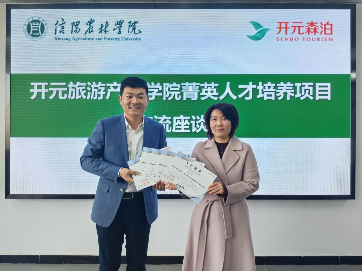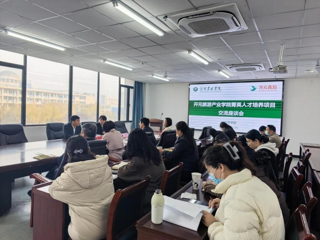 上午,我院与企业召开开元旅游产业学院菁英人才培养项目交流座谈会,学院党委书记朱长明、副院长陈婷(主持工作)、副院长张欢欢、副院长余兵,以及部分旅游管理和酒店管理专业教师参加。会上,校企双方围绕旅游行业发展新趋势、课程体系优化、学生实习基地建设、学生综合能力培养等内容进行了深入务实的交流。双方一致同意,未来将进一步巩固和拓展合作领域,将开元旅游产业学院打造成为产教深度融合的示范平台,共同培育更多适应行业未来发展的旅游菁英人才。此次交流,陈鹏还带来了在第五届“开元杯”—带你出道全国大学生旅游营销大赛中表现优异的参赛学生的入职邀请,这不仅是对同学们专业能力的充分肯定,更是开元集团深化校企合作、前置人才选拔、构建青年人才储备体系的重要举措。