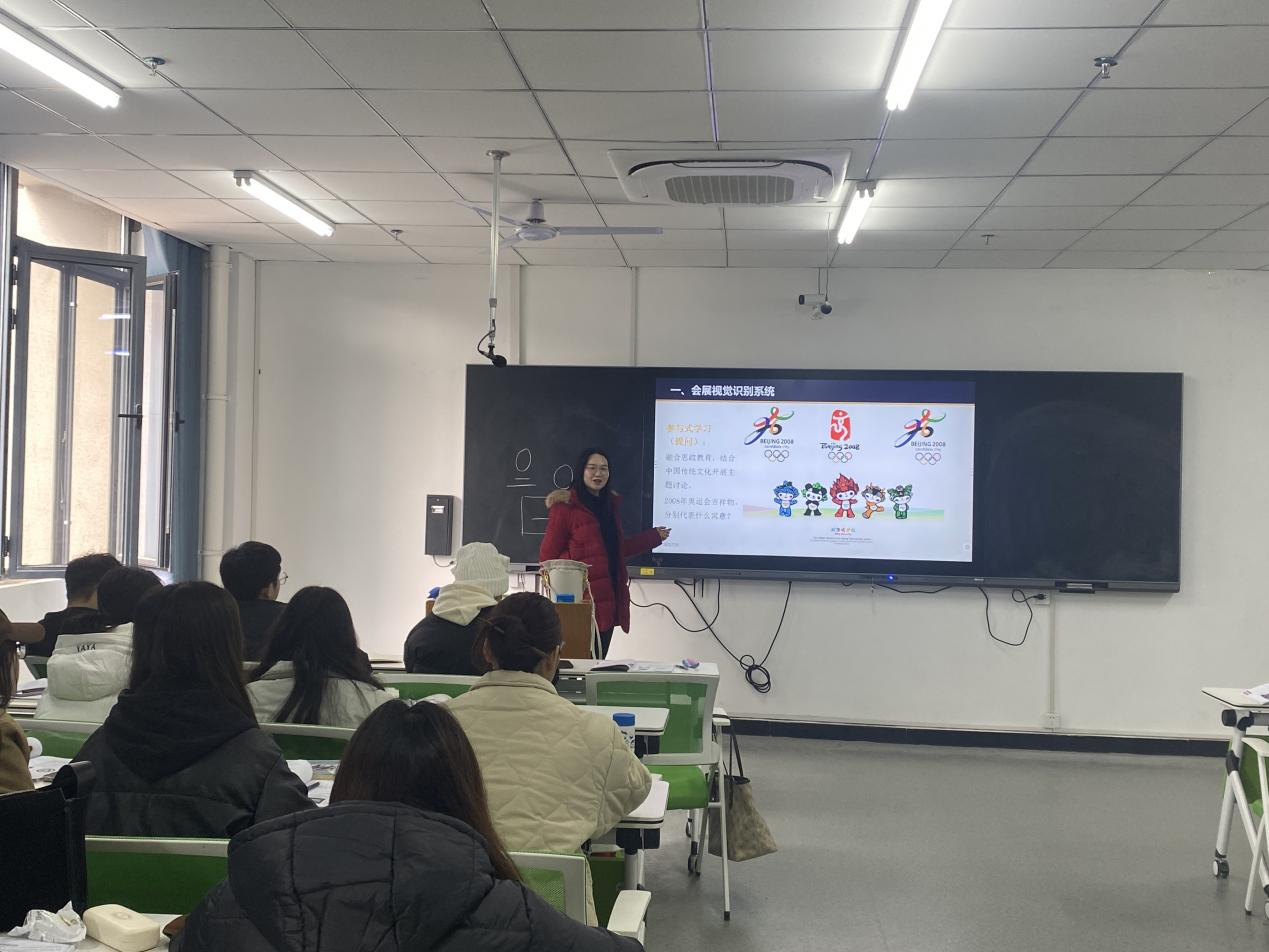 《会展展示设计》是会展经济与管理专业的一门专业基础必修课。在课堂讲解中,李老师将思政元素融入其中,承上启下,首先,邀请1-2名学生针对上节课布置的课后思考进行讲解,畅谈中国在“一带一路”大背景下,各大城市的发展现状认识。随后,运用各种教学方法图文、视频结合的形式,讲授会展视觉识别系统的基本要素和应用要素,会展标识设计的方法、原则及表现手法等课堂新识。在小组互动环节,让学生从会展标识设计的方法、原则及表现手法等方面分析讲解具有中国特色的会展标识,理解标识设计的构思与创意方法,学习优秀案例和思想精髓,弘扬民族特色,建立文化自信。课堂气氛活跃,同学们踊跃发言。