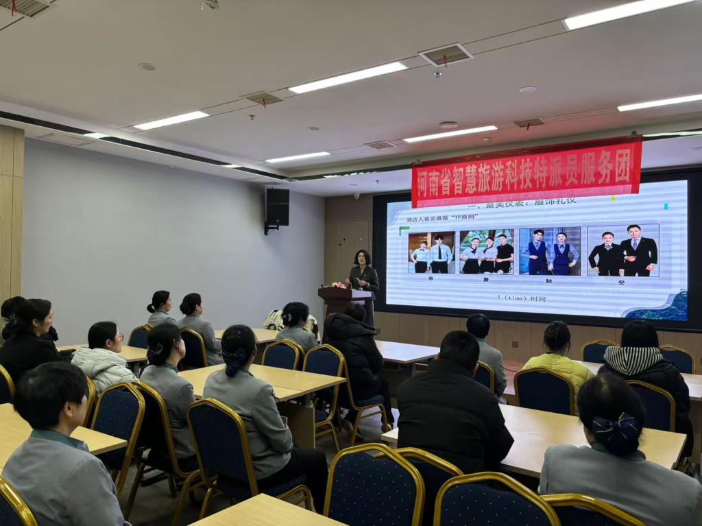 3月14日下午,服务团再度走进鲁山永立艾维斯酒店,针对此前调研排查出的问题,开展专题培训与现场指导工作。代沐冉老师以“酒店服务运营”为主题,从酒店服务规范、运营流程、仪容仪表等多个维度切入,采用理论讲解与实操示范双轨并行的方式,为酒店员工带来了一场系统性培训,切实提升了从业人员的服务标准化水平;李维嘉老师则将目光聚焦于“文旅自媒体运营实操”,围绕内容创作技巧、流量引流策略、粉丝精细化运营等核心要点,结合文旅行业典型案例拆解实用方法,助力酒店打通线上宣传推广的全新路径。