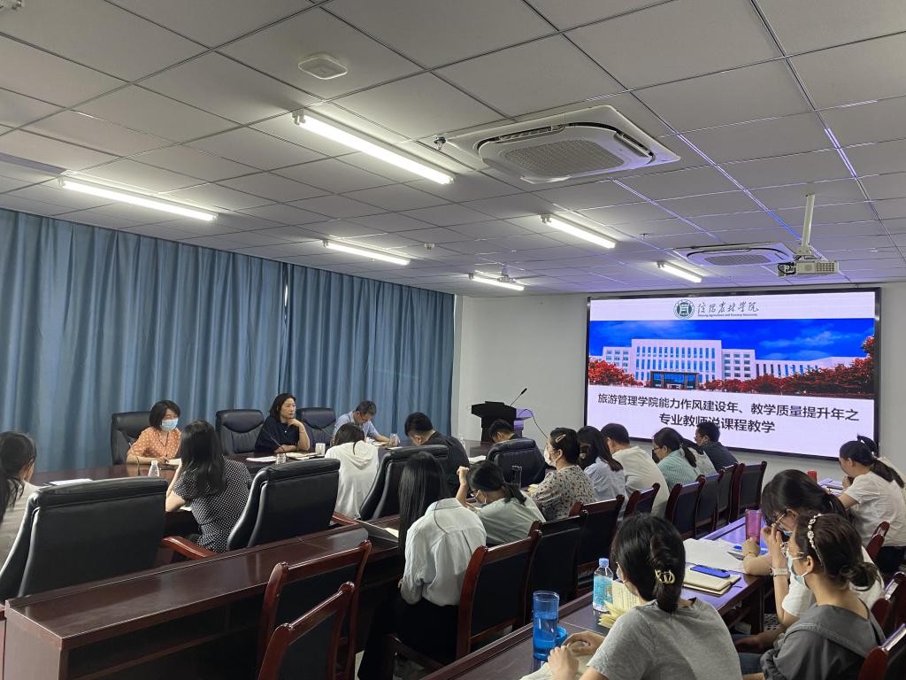 为贯彻落实省教育厅《河南省本科高校“课堂教学质量提升年专项行动”实施方案》精神和学院“能力作风建设年”活动要求,进一步提高教师师德素质,激发教师教研热情,提升教学效果,2022年6月7日下午,旅游管理学院在双创中心310举行第一次专业教师说课程的教学活动,学院全体教师参加。