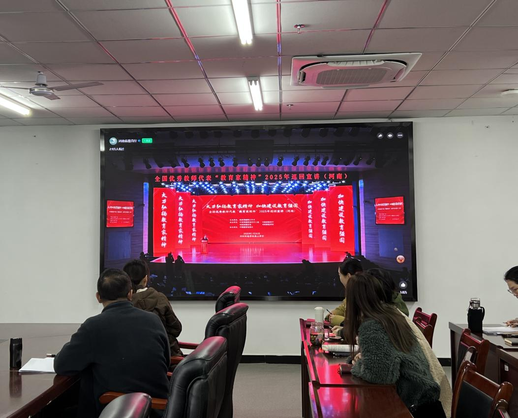 为深入贯彻落实习近平总书记关于弘扬教育家精神的重要指示精神,激励广大教师大力弘扬践行教育家精神,按照学校要求,2月26日上午我院组织全体教职工在310会议室收看“教育家精神2025年巡回宣讲活动”,共同学习教育家精神。