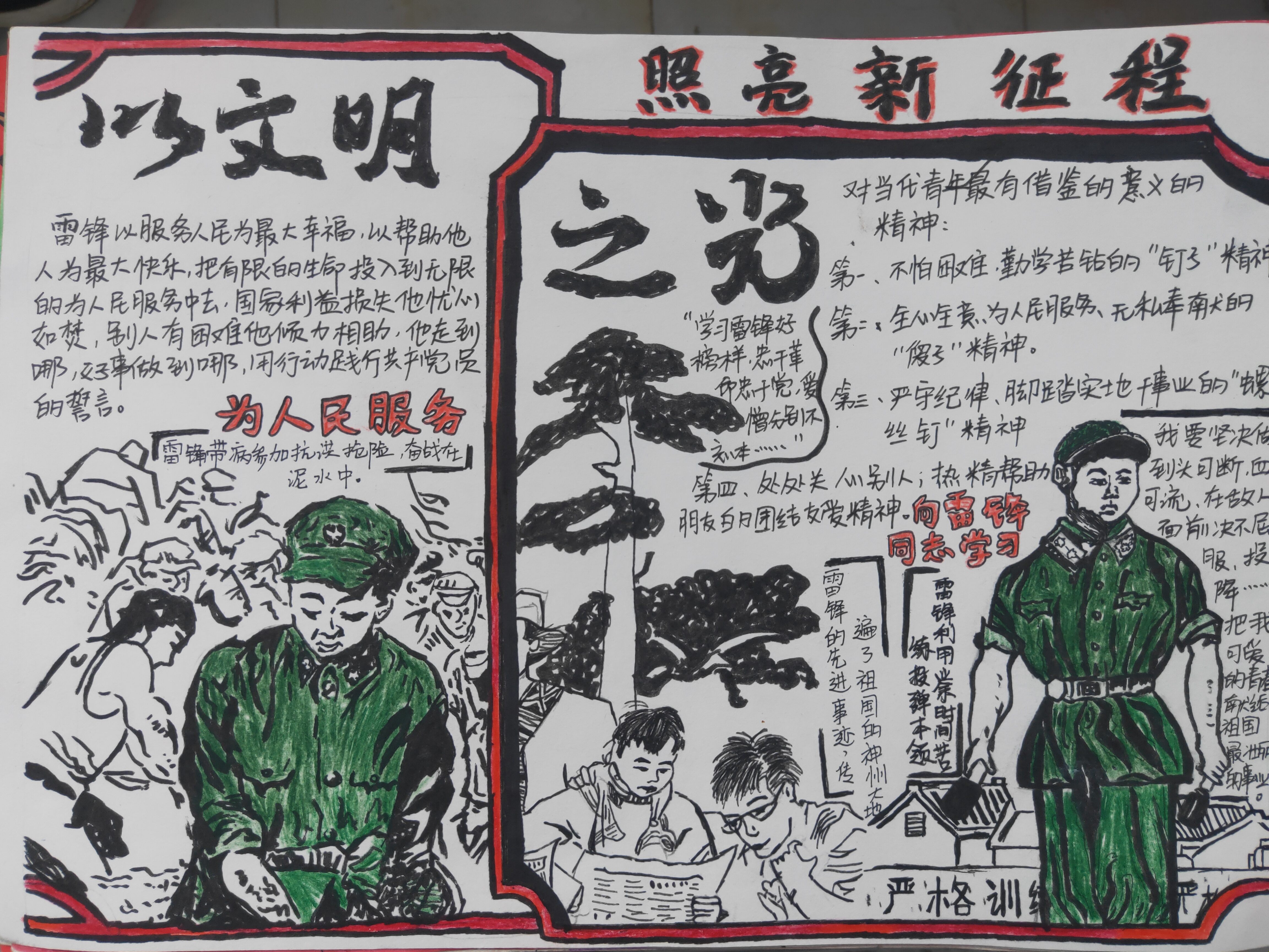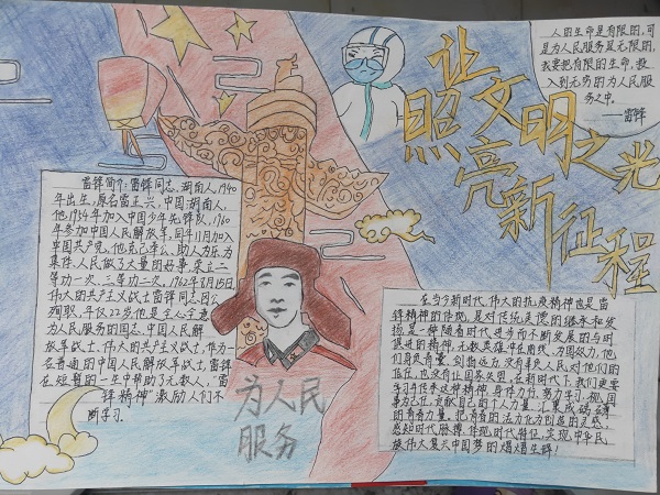 “让文明之光,照亮新征程”主题手抄报比赛的顺利开展,充分展现了我院学生学习雷锋精神的良好风气。通过该活动,我院青年学生深入学习了雷锋的先进事迹,深刻的领悟到了雷锋精神的内涵,有助于我院学生培养良好的品格,树立正确的世界观、人生观、价值观。(撰稿人:张博  审核人:杜丽)