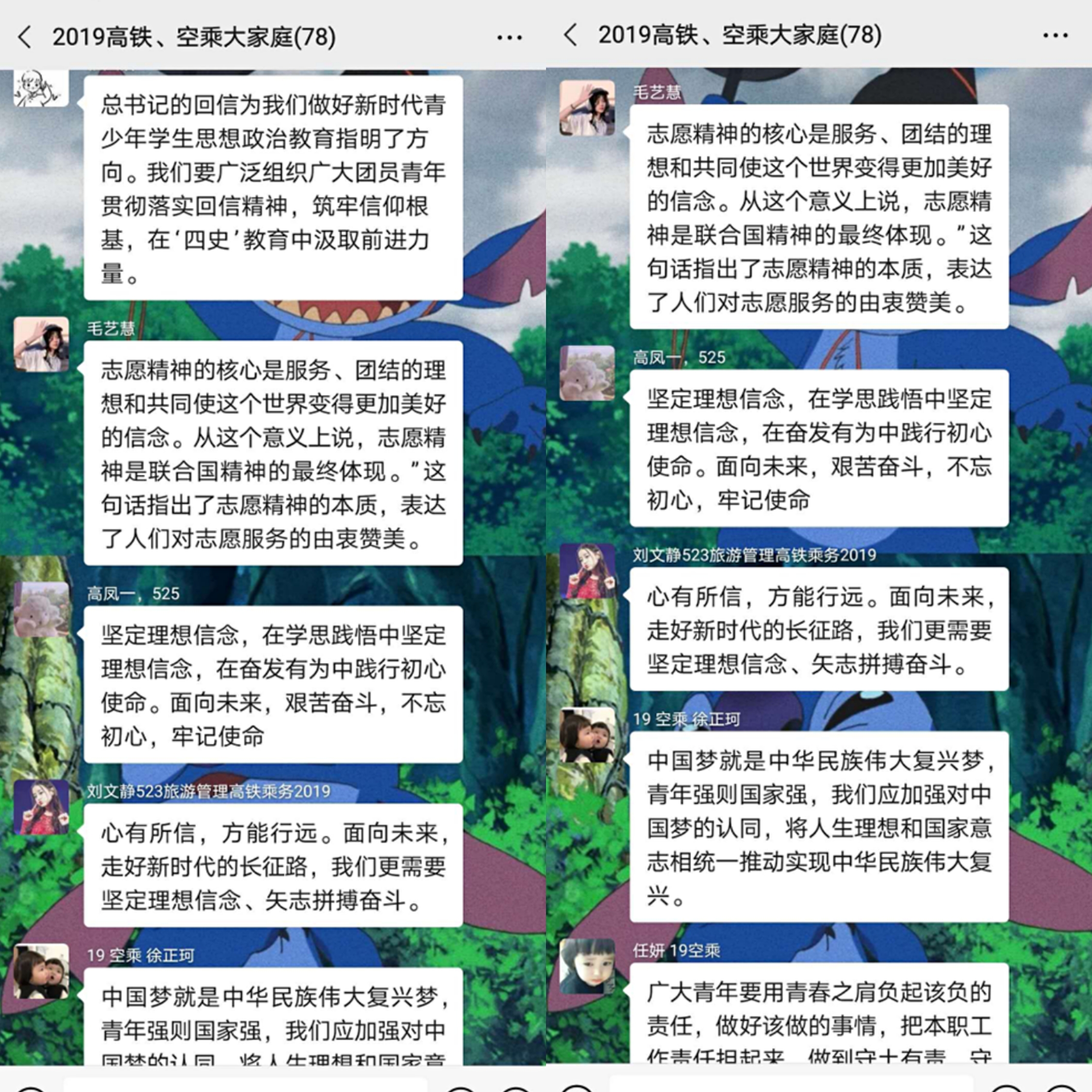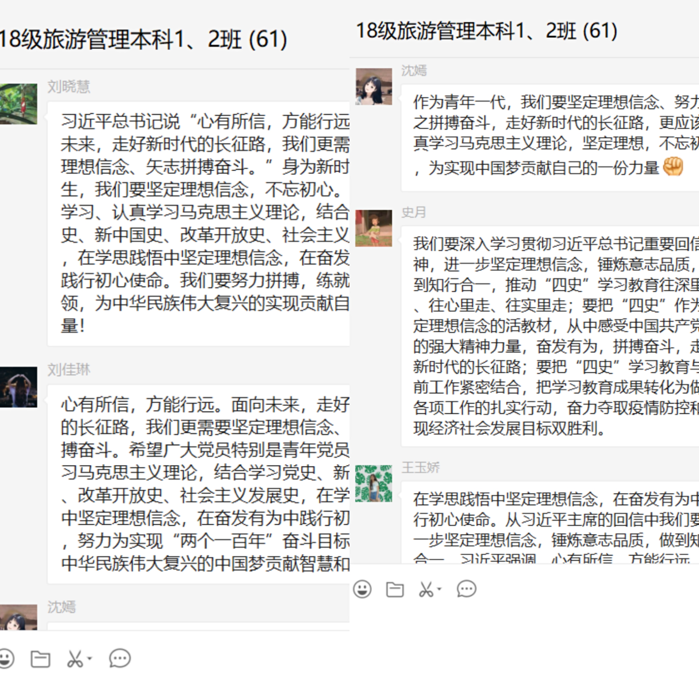 此次团日活动以各团支部为单位陆续开展,活动中各班团支书向同学们讲解了此次团日活动的主题和意义,并传达了此次团日活动的主要目的。活动主要以阅读习近平总书记给复旦大学《共产党宣言》展示馆党员志愿服务队全体队员的回信、团支书带领学习和讲解回信内容、各团支部分小组讨论的形式展开。在学习讨论过程中,广大青年团员踊跃参与并积极发表学习感言,纷纷表示:作为新时代青年,我们要秉持“一生信仰,化于内心”的初心,要争当《共产党宣言》的忠实传承者和新时代奋斗者,抓住新时代新机遇,在摸爬滚打中锻炼自己,坚定理想信念,站稳人民立场,练就过硬本领,投身强国伟业。
